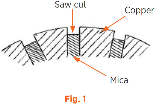 After undercutting, commutator must be carefully inspected to assure all copper particles removed, all bars chamfered, and all sharp edges and burs eliminated. Slots should be individually checked and reworked to remove any traces of fin or side mica.