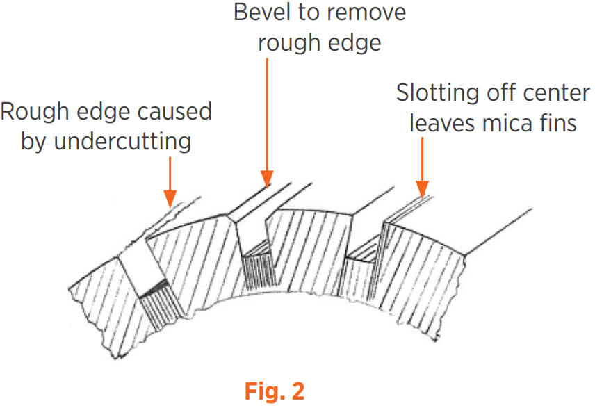 Undercutting may leave a bur (see Fig. 2). Edge of bar might become work hardened, leading to nonuniform wear and possible damage to brushes. Edges of bars must be chamfered to remove bur and work hardened area through use of suitable slotting file or specialty scraper. A chamfer of 1/64” (.4mm) is usually adequate. See Hand Tools section of catalog for slotting files and chamfering tools.