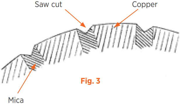 U-slots (Fig. 1) are generally preferred if slots are accessible for easy cleaning. If cut carefully, these slots are effective until commutator has worn down full depth of undercut. Slot should be cut 1/32”-3/64” (.031-.046) deep, or to OEM specifications. If slot cut too deep, accumulated dust will not be thrown out by the centrifugal action of the rotating commutator.