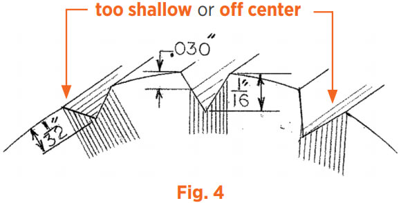 When undercutting with compound land saws, bottom of slot will appear flat. However, as a result of reverse taper on alternate teeth, slot bottom will have slight pyramid or convex profile.